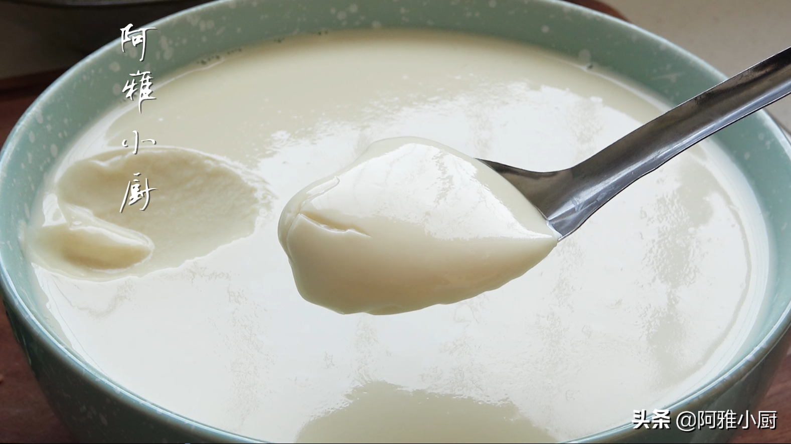 5.豆浆晾到90度用筷子挑掉上面的豆皮,把豆浆倒入大碗中,用铲子边搅拌变把花开的内酯倒进来,最后用铲子止住豆浆让豆浆变平静,撇掉表面的浮沫,盖上盖子静置10分钟,十分钟后豆浆自然就凝固成豆腐脑了。