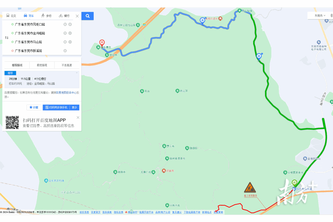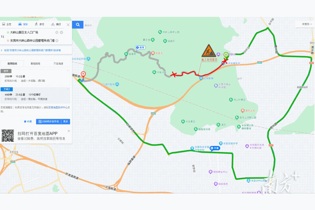 图2:封闭大岭山森林公园大岭山景区主入口后车辆绕行路线一