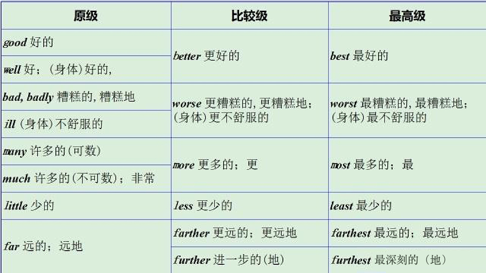 中考英语备考,得记数量庞大的不规则变化,相对于动词的大量不规则变化,不规则的形容词和副词只有 8 组,而且还有一些比较级和最高级公用,这样就更好记了。