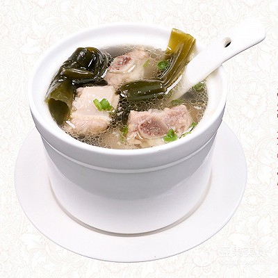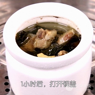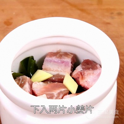 3、发胀海带,发好的海带12个(2两),依次放入大号的汤杯中,用筷子扒平;再依次下入排骨7块(1两4?1两6),再用筷子扒平,下入两片小姜片,取一量杯,倒入220毫升清水,将220毫升清水全部加入汤杯中,加入盐3克;