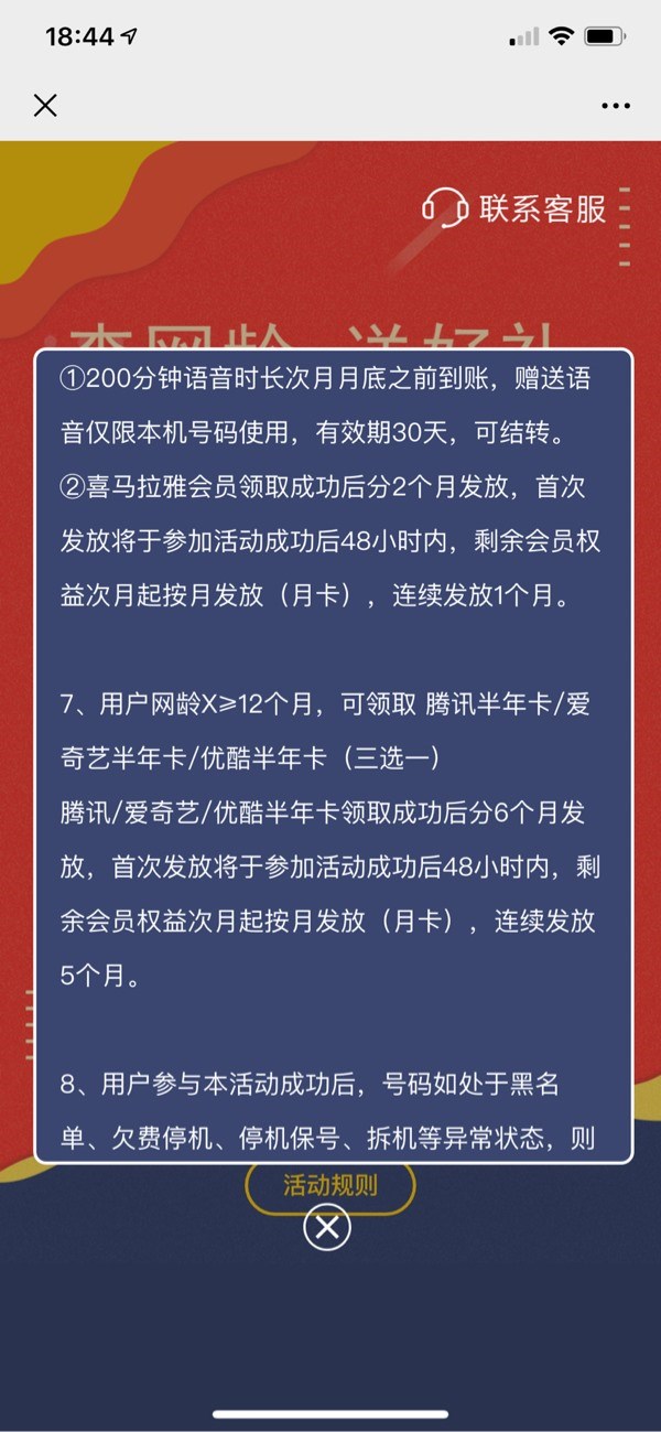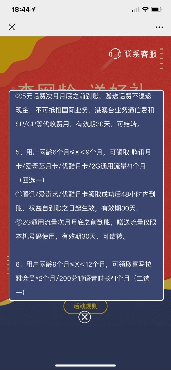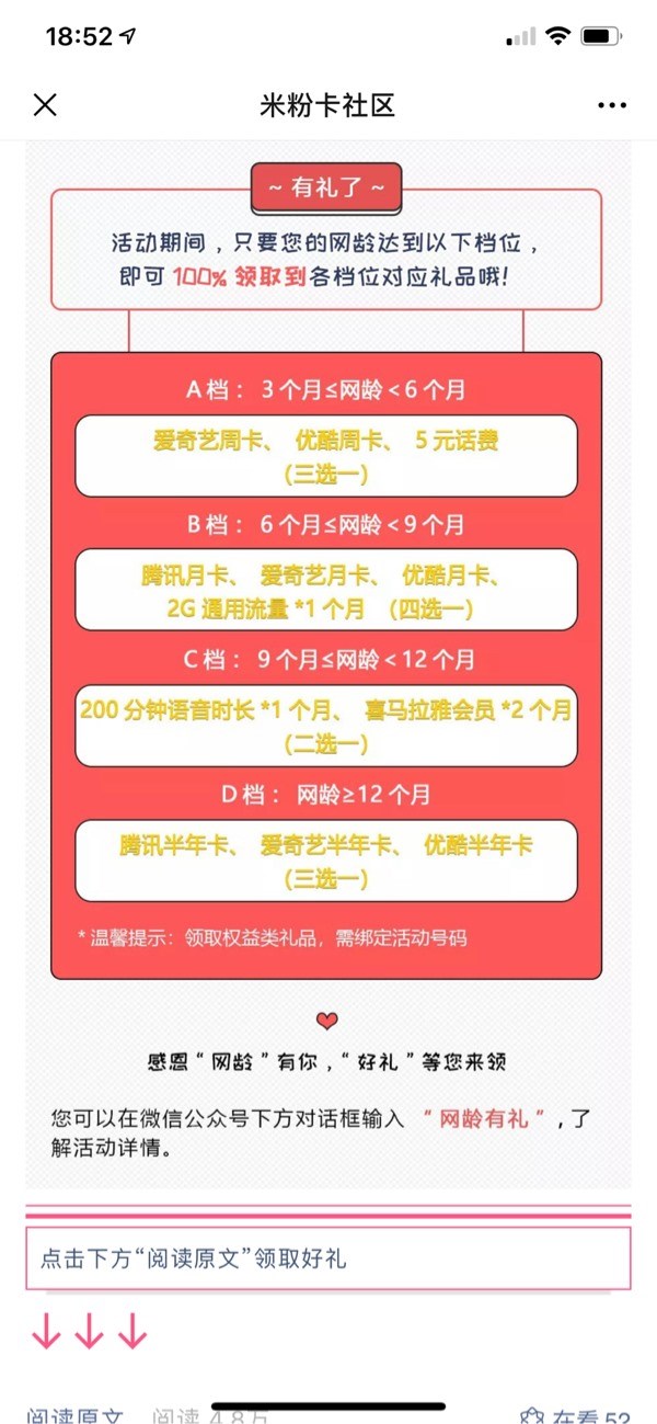 根据网龄的时间长度,A档次3个月到6个月,可以选爱奇艺周卡、优酷周卡、5元费(三选一),B档次6个月到9个月,可以选腾讯月卡、爱奇艺月卡、优酷月卡、2GB通用流量一个月(四选一),C档次9个月到12个月,可选200分钟语音通话1个月、喜马拉雅会员2个月(二选一),D档次大于12个月,可以选腾讯半年卡、爱奇艺半年卡、优酷半年卡(三选一)。