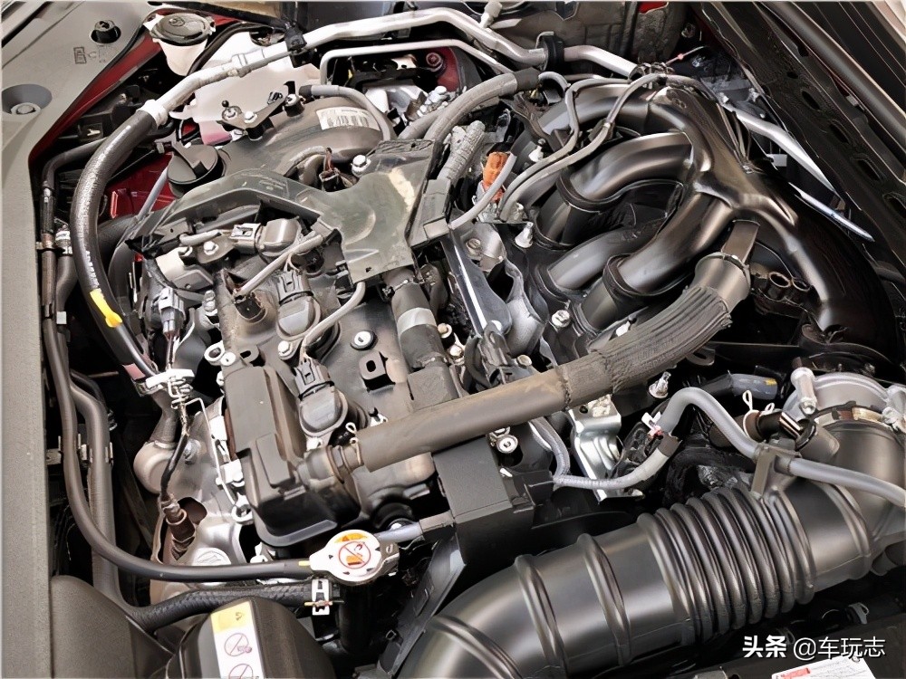壮观的发动机罩实际上比 V-6 发动机小,...