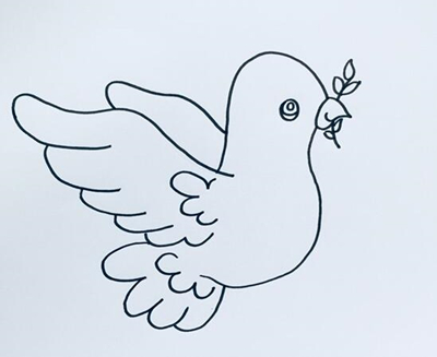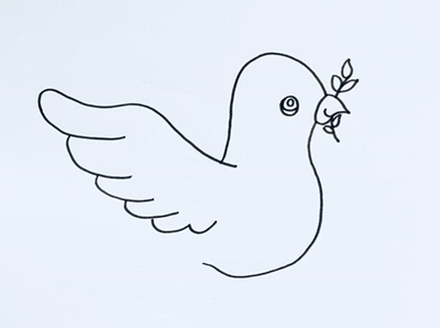 第二步接着画出鸽子身侧一只展开着的翅膀,然后可以把和平鸽的眼睛画好,眼睛位于和平鸽的头部位置,并且还可以将和平鸽的鸟喙啄着的一根橄榄枝给画出来,同时还需要补充上枝条上的叶子。