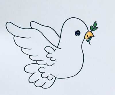 第四步是最后一步,首先将和平鸽的鸟喙进行涂色,选择的颜色为黄色,接着可使用绿色涂橄榄枝叶,再用黑色的彩笔将它的眼睛涂黑,一只和平鸽就画好了。