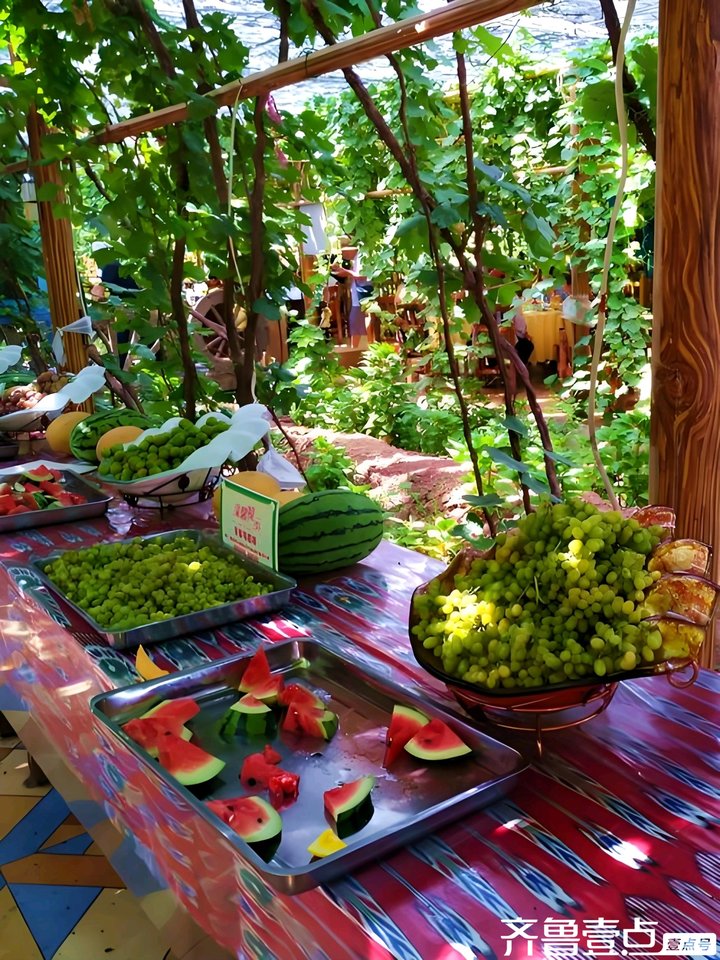 翌日,在导游的引领下,前去吐鲁番某生产队参观,临下车前,导游教会我等几句维吾尔族问候语,以及见面时,右手贴于心房处,并躬身致礼的动作。队长艾力江热情接待,约五十多岁了吧,头戴一顶绿色小帽,面庞很喜庆。在一座爬满葡萄架蔓藤的长廊棚子里,走近一个长条木炕旁,上面摆放着一溜小桌子,桌上放着若干盛满水果的盘子,有刚刚切开的西瓜,以及青色晶莹的小葡萄。男的依次脱鞋上炕,女的前排入座。