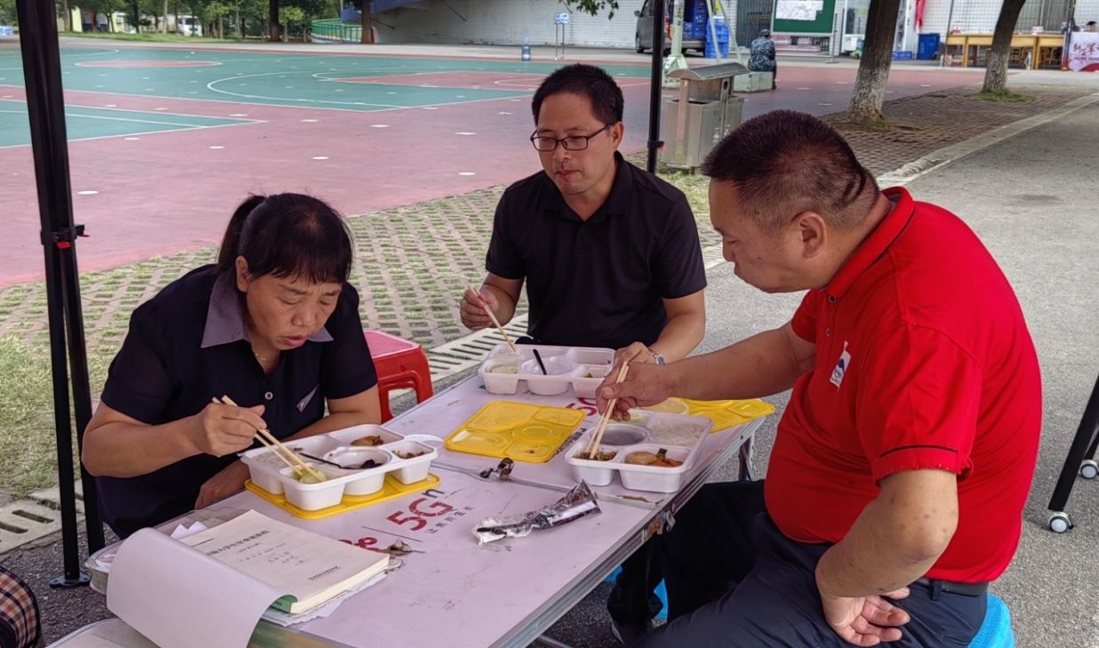 80斤一箱的大米,搬起来很是费力。工作人员有限,看到大家一个个累的气喘吁吁、汗流浃背,驻村工作队员也主动加入到搬运行列,忙的自顾不暇。中午就在军训棚下简单吃个盒饭,马上又投入到配送行列,一直忙到下午6点,终于抢在下班前,所有物资精准配送到位,分毫不差。