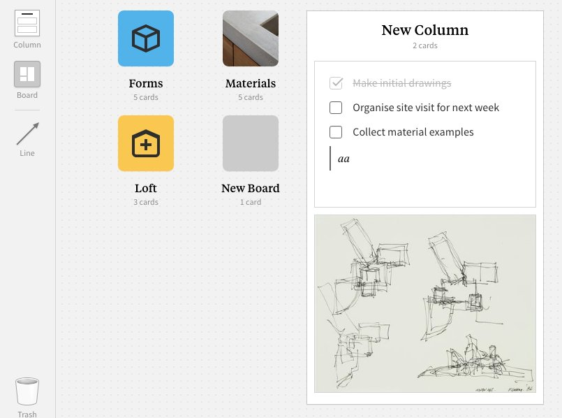Milanote板可以是一个私人的思考场所,也可以是一个共享的协作工作区。当需要思考时,它可以收集你所有的想法、笔记、图片在画板上,任你随意排布:当需要分享协作时,可以与团队分享你的笔记,以进行协作,获得反馈或寻求输入。