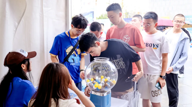 杭州国际校园内,志愿者引导新生逐一办理报到手续。快速采集身份与人脸信息,激活银行卡,便捷领取物资,在场工作高效有序,有条不紊。