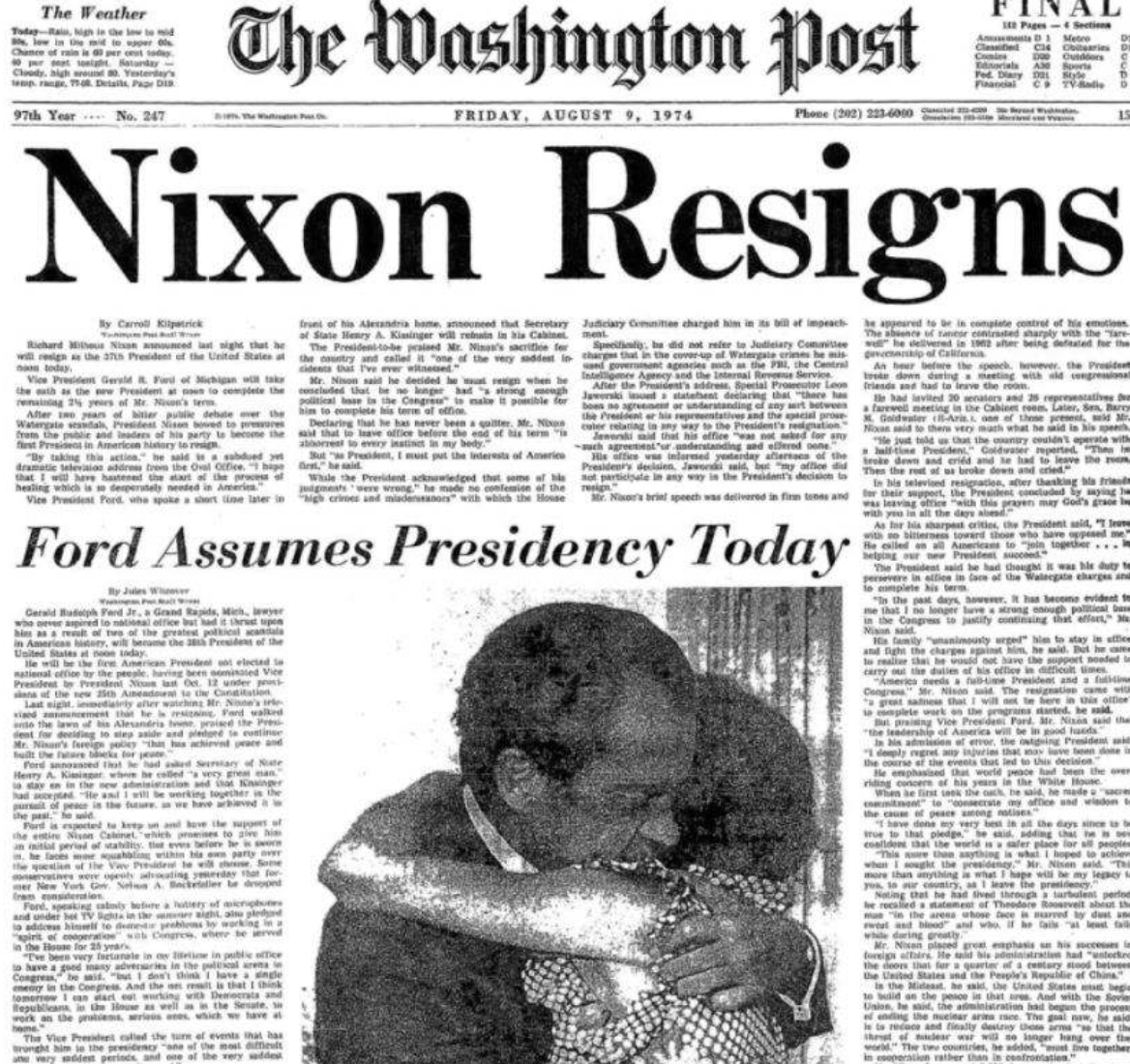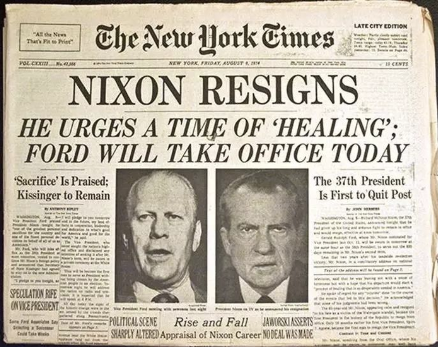 974年7月24日,美国最高法院以8票对0票一致裁决尼克松交出传调的录音带,并提出了对他的几大弹劾提案:阻挠司法程序、滥用总统权力、违背宪法、拒绝国会传讯,至此,尼克松大势已去,辞职也只是时间问题。