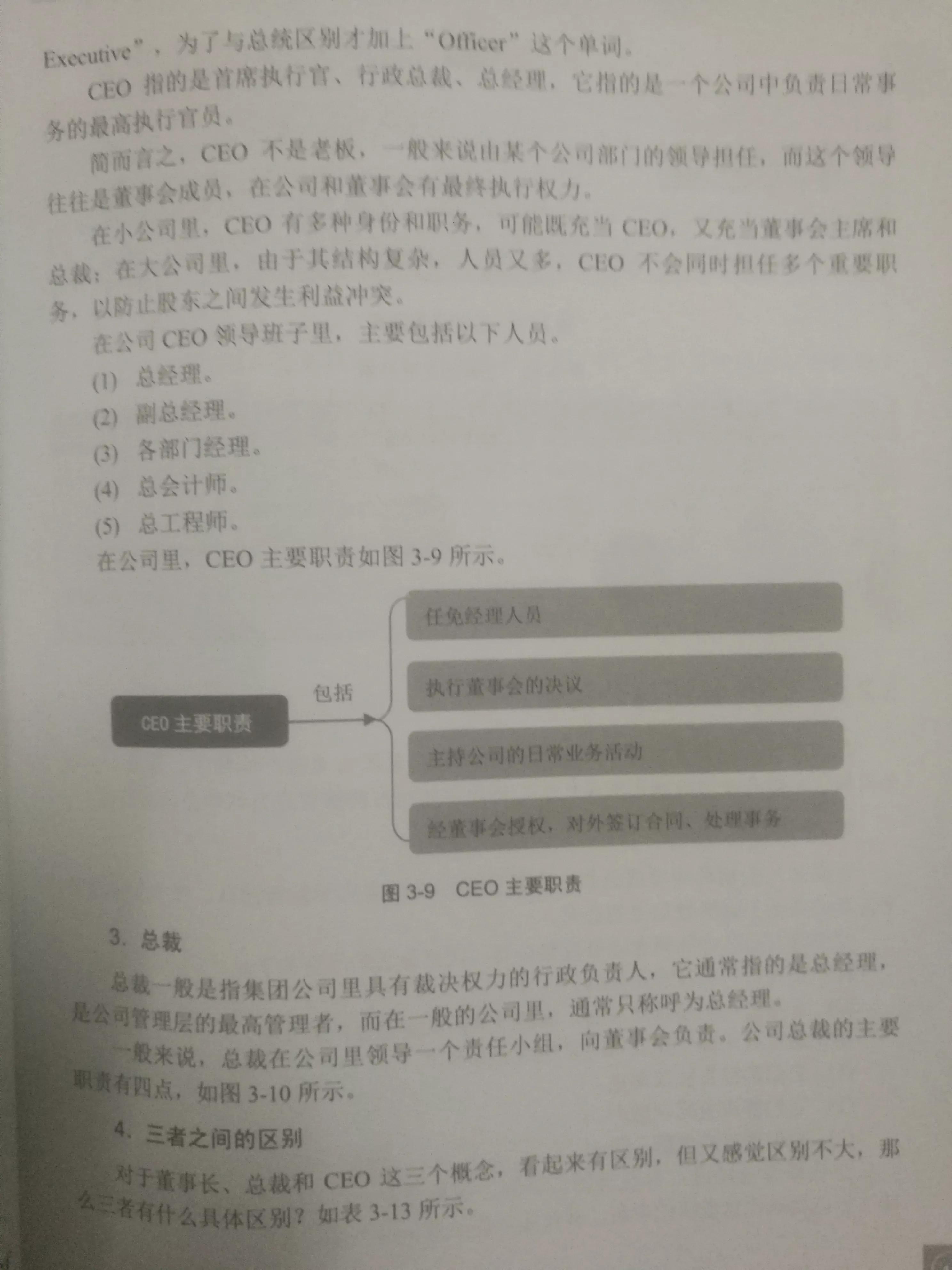 CEO主要职责包括(1)任免经理人员(2)执行董事会的决议(3)主持公司的日常业务活动(4)经董事会授权,对外签订合同、处理事务。