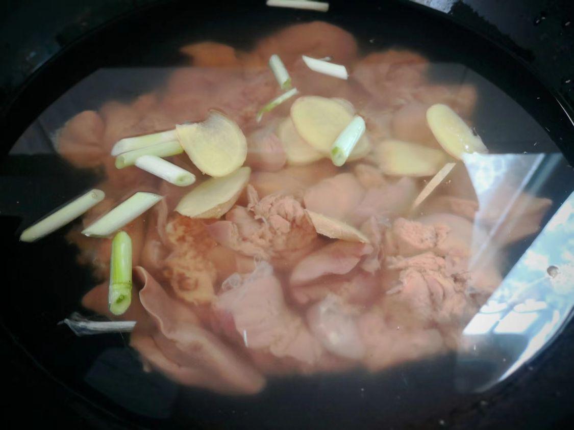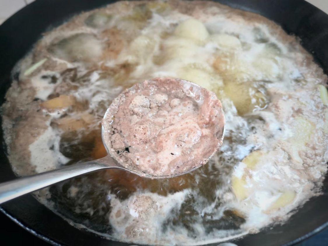 5、锅里有一层血沫,用勺子把浮沫去掉,大概煮5分钟捞出来,放进温水中冲洗干净,捞出控干水分。