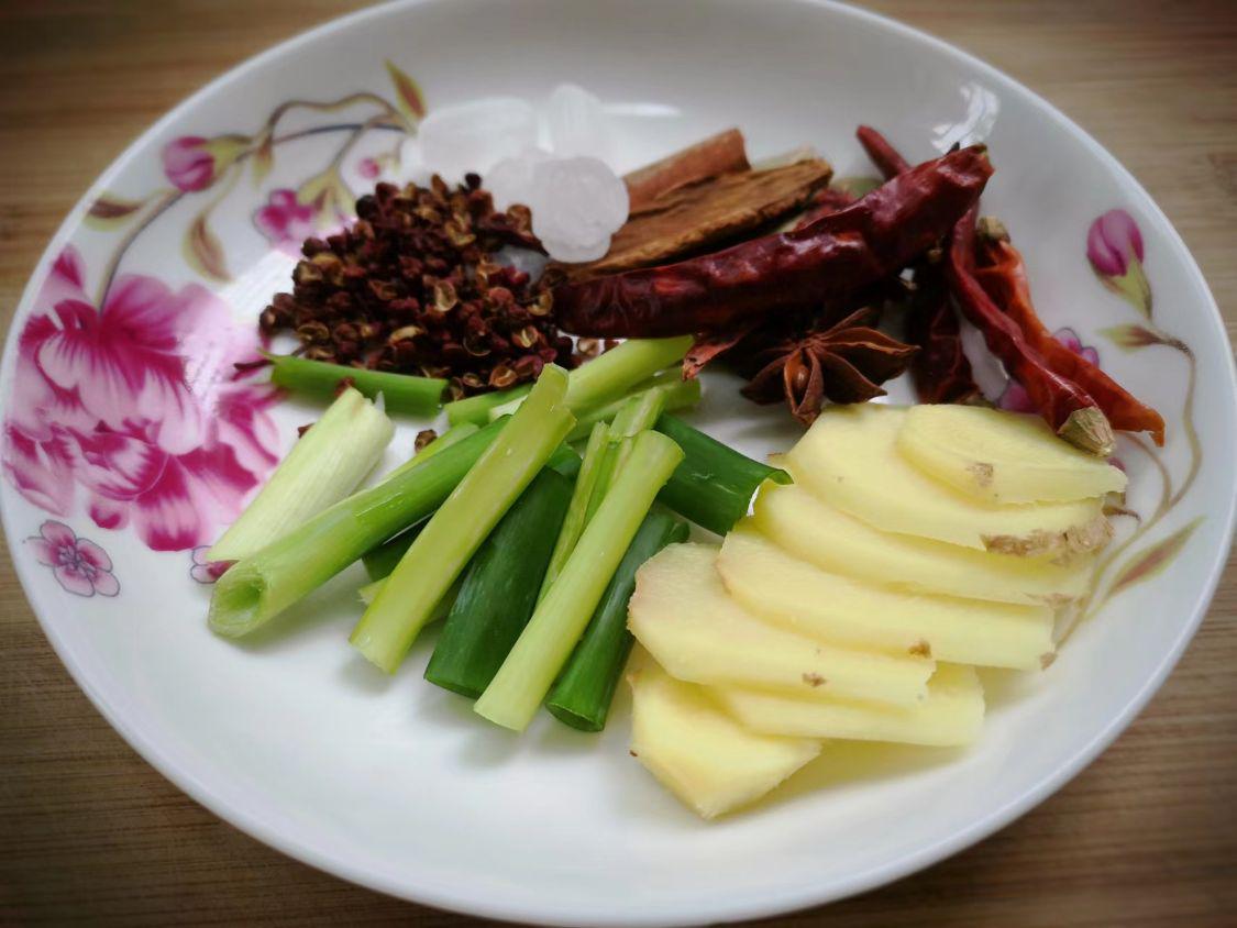 3、接下来准备一些小料,姜片,葱段,3根辣椒,一段桂皮,2个八角,少许花椒,几粒冰糖。