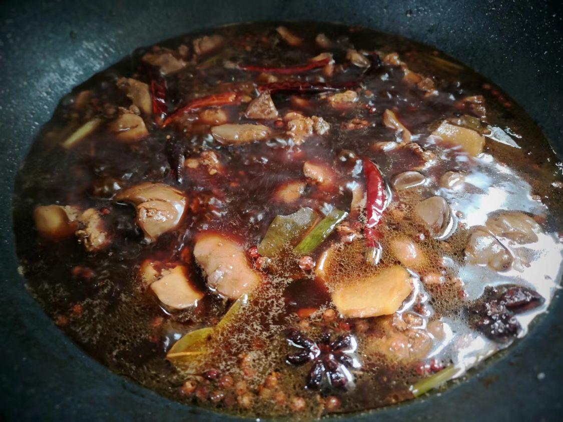 食材:鸡肝、盐、姜片、葱段、辣椒、桂皮、八角、花椒、冰糖、料酒、黄豆酱、生抽、老抽、鸡精。