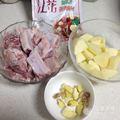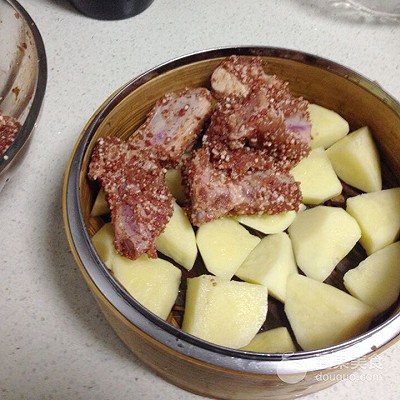 5、土豆加少许盐拌匀摆在蒸茏里,将排骨铺在土豆上面。
