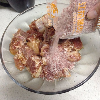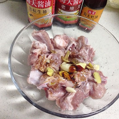 3、加适量生抽、老抽、姜、蒜、蚝油料酒拌匀。腌制约30分钟。