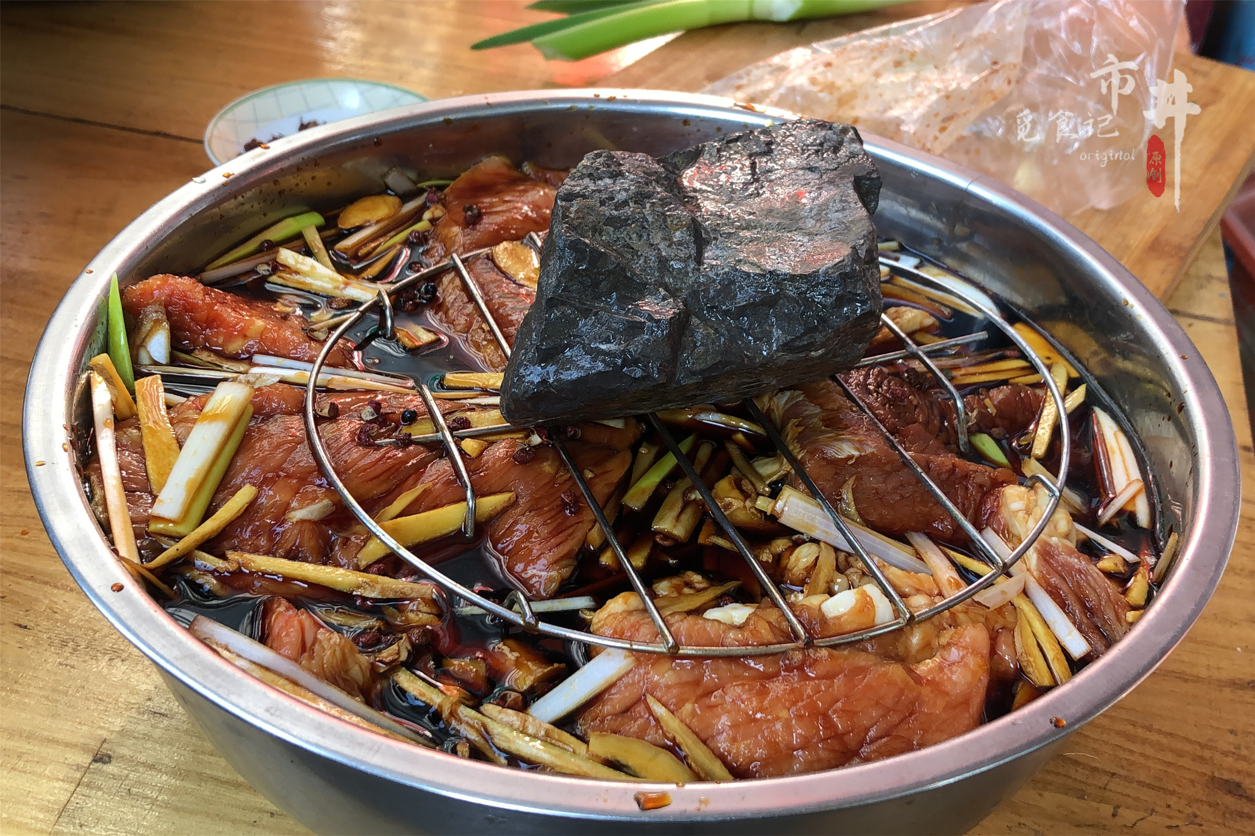7、找一个合适的工具压住牛肉,再找一个大石头压住,避免牛肉浮起来。