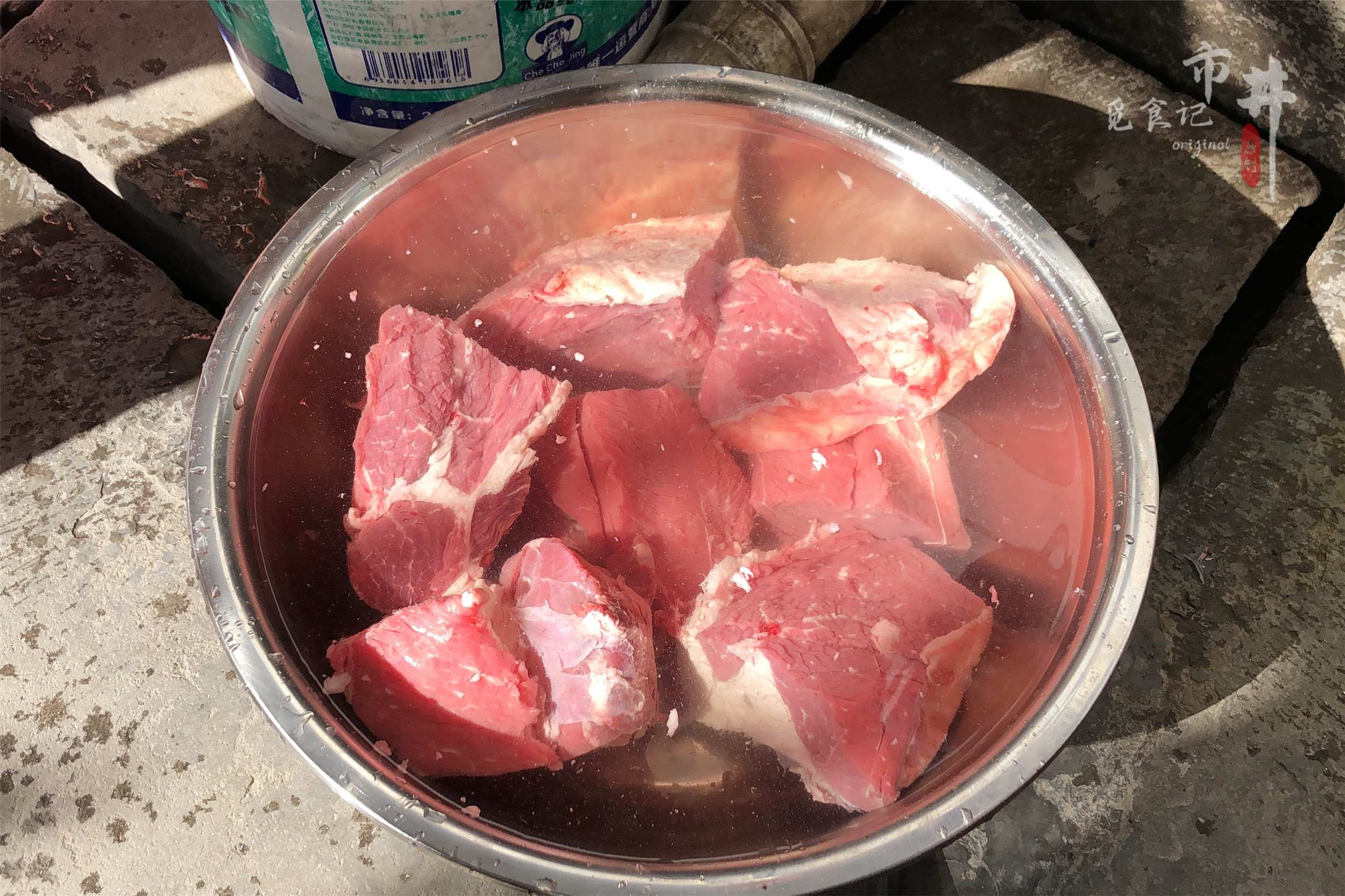 1、牛肉买回来以后,需要先浸泡,这个浸泡的时间比较长,一般来说冬天需要18个小时左右,夏天需要12个小时左右,准备一个比较大的盆子,将牛肉切大块后浸泡在清水中。
