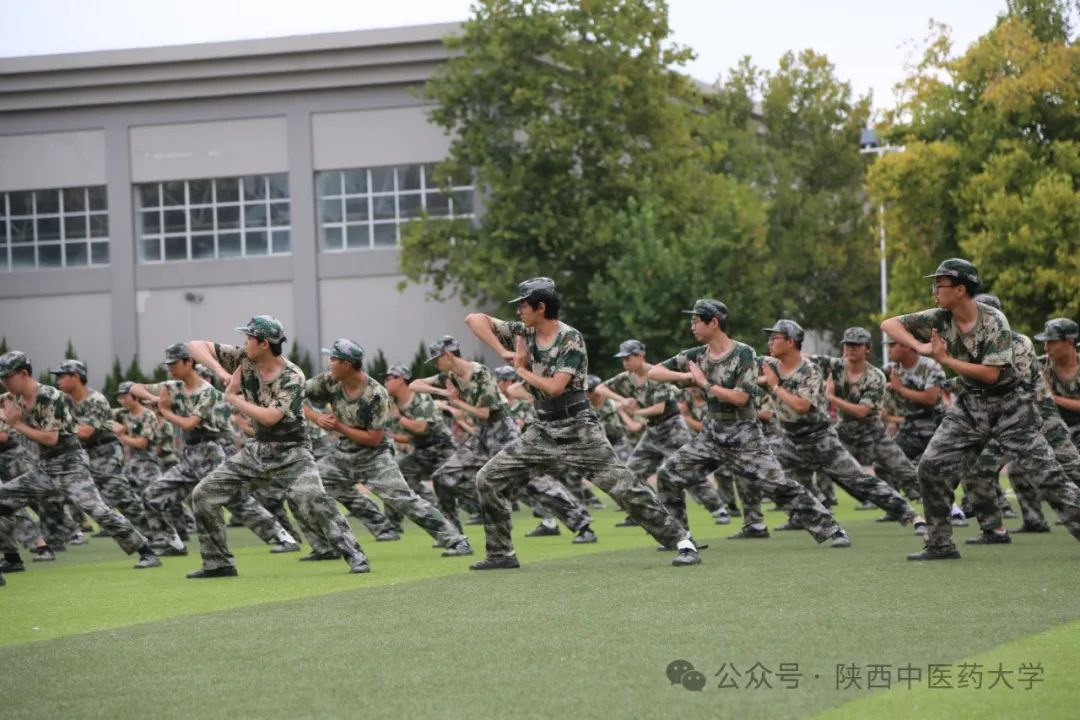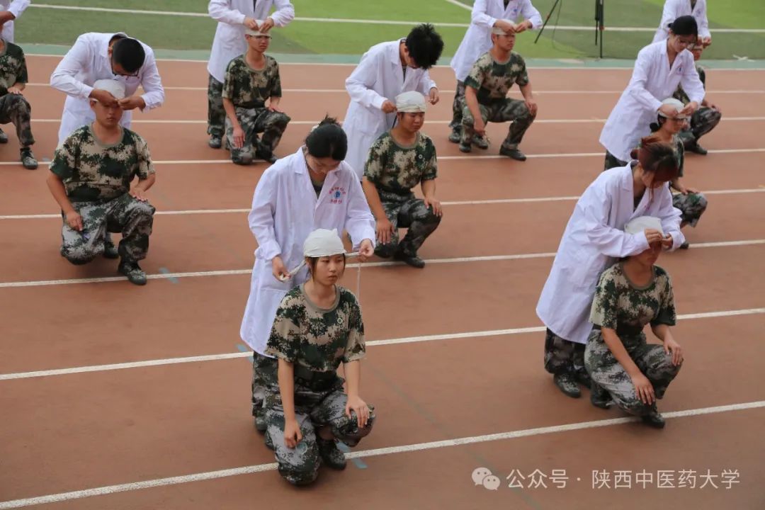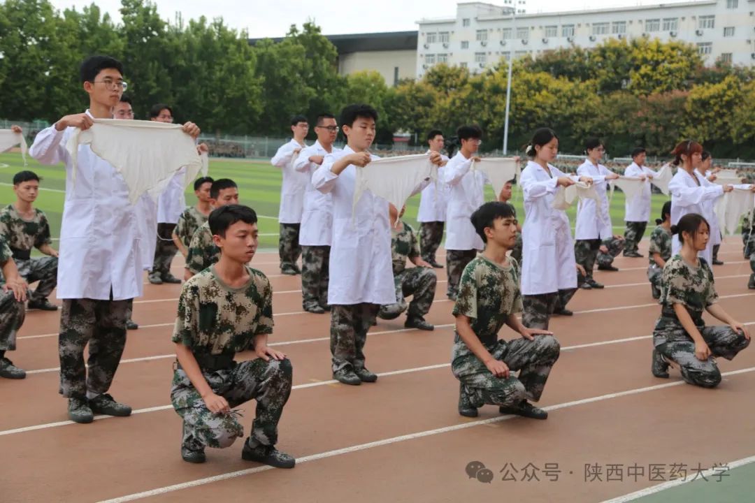 军训汇报演出环节,2024级新生依次进行了队列动作、擒敌拳、匕首操、军体拳、院前急救演练等展示。方队整齐划一、口号激昂嘹亮,展现了陕中医学子朝气蓬勃、英姿飒爽、神采飞扬的激情与活力。