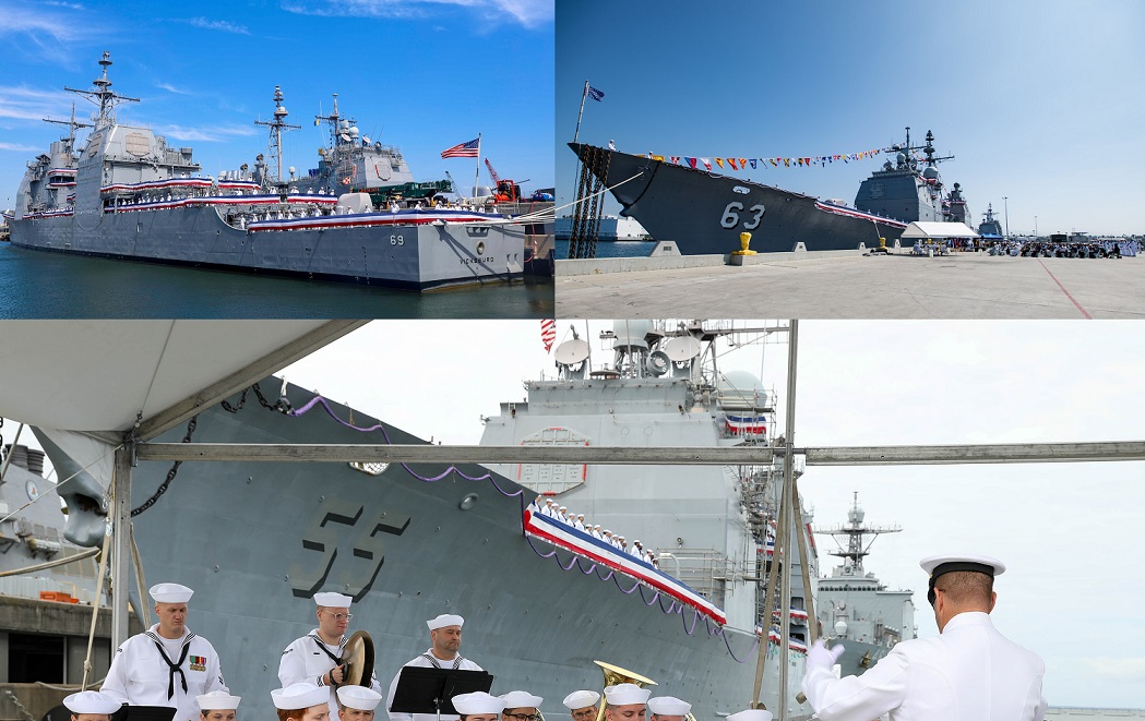 今年早些时候退役的另外3艘“提康德罗加”级巡洋舰,左上、右上和下方分别为CG-69“维克斯堡”、CG-63“考彭斯”和CG-55“莱特湾”美国海军