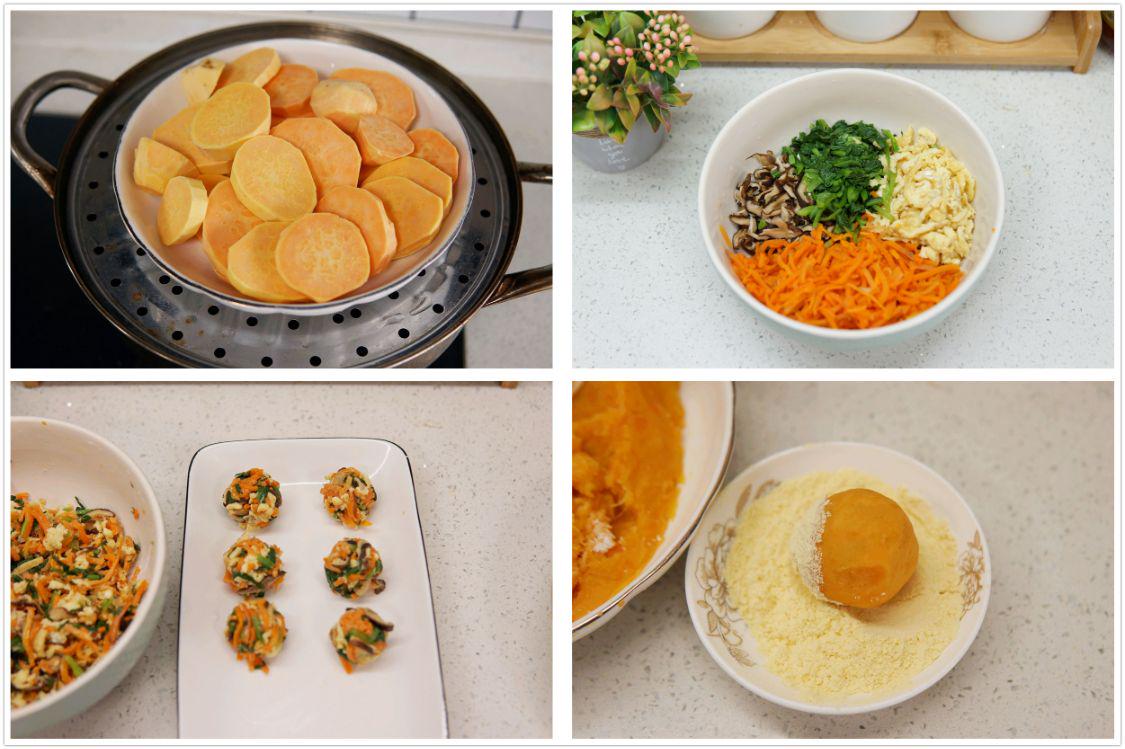 所需食材:红薯、干香菇、红萝卜、青菜、鸡蛋、玉米淀粉、玉米粉、盐。