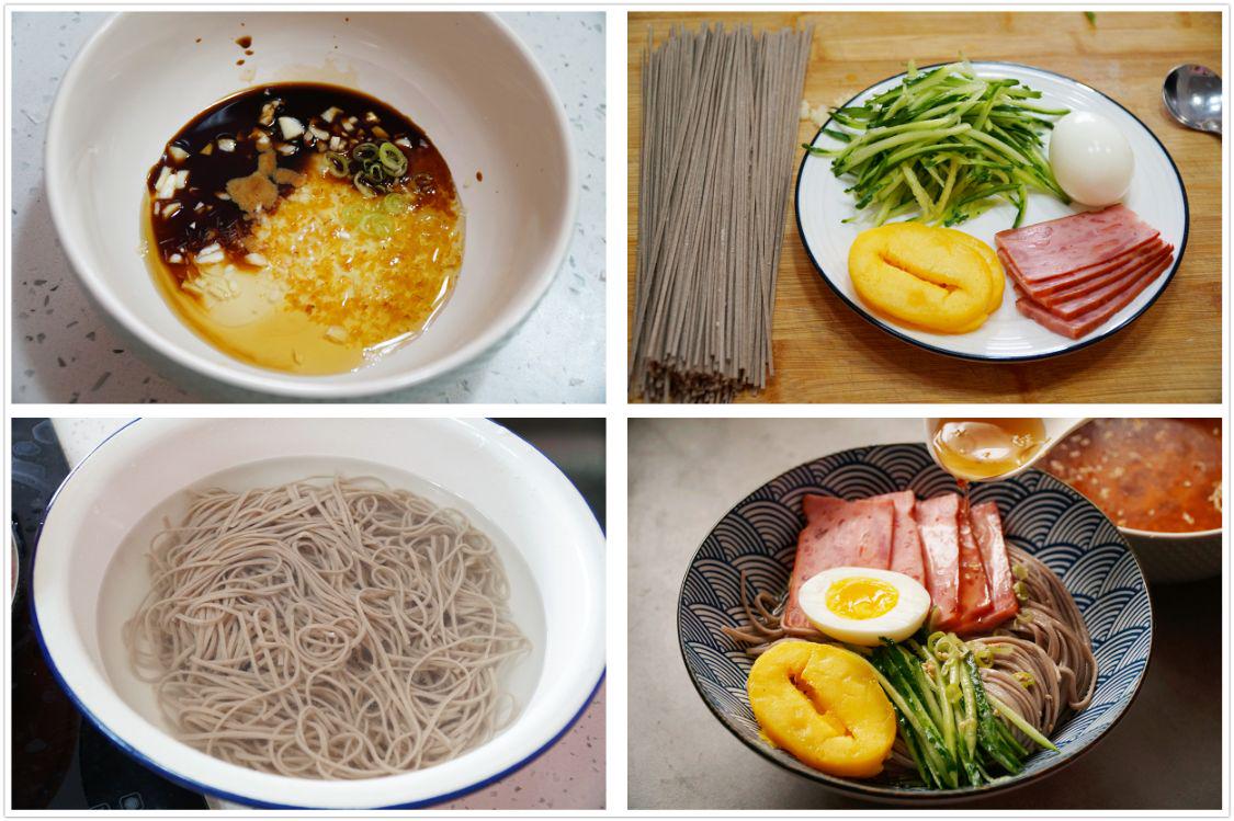 所需食材:荞麦面、黄瓜、火腿、鸡蛋、芒果、葱、蒜、生抽、米醋、蜂蜜、胡椒粉、芝麻、鸡精。