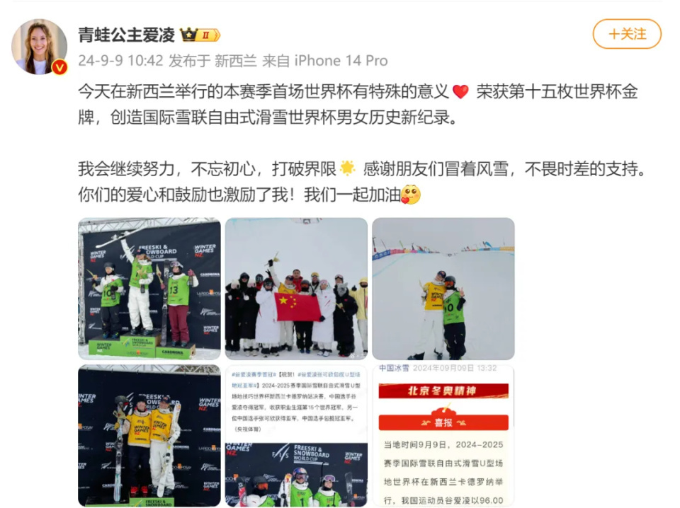 2024年9月,在2024-2025赛季国际雪联自由式滑雪U型场地技巧世界杯新西兰卡德罗纳站决赛中,谷爱凌带伤出战夺得赛季首冠。这是谷爱凌的第15个世界杯冠军,她打破了国际雪联纪录,独享男女运动员榜历史第一。