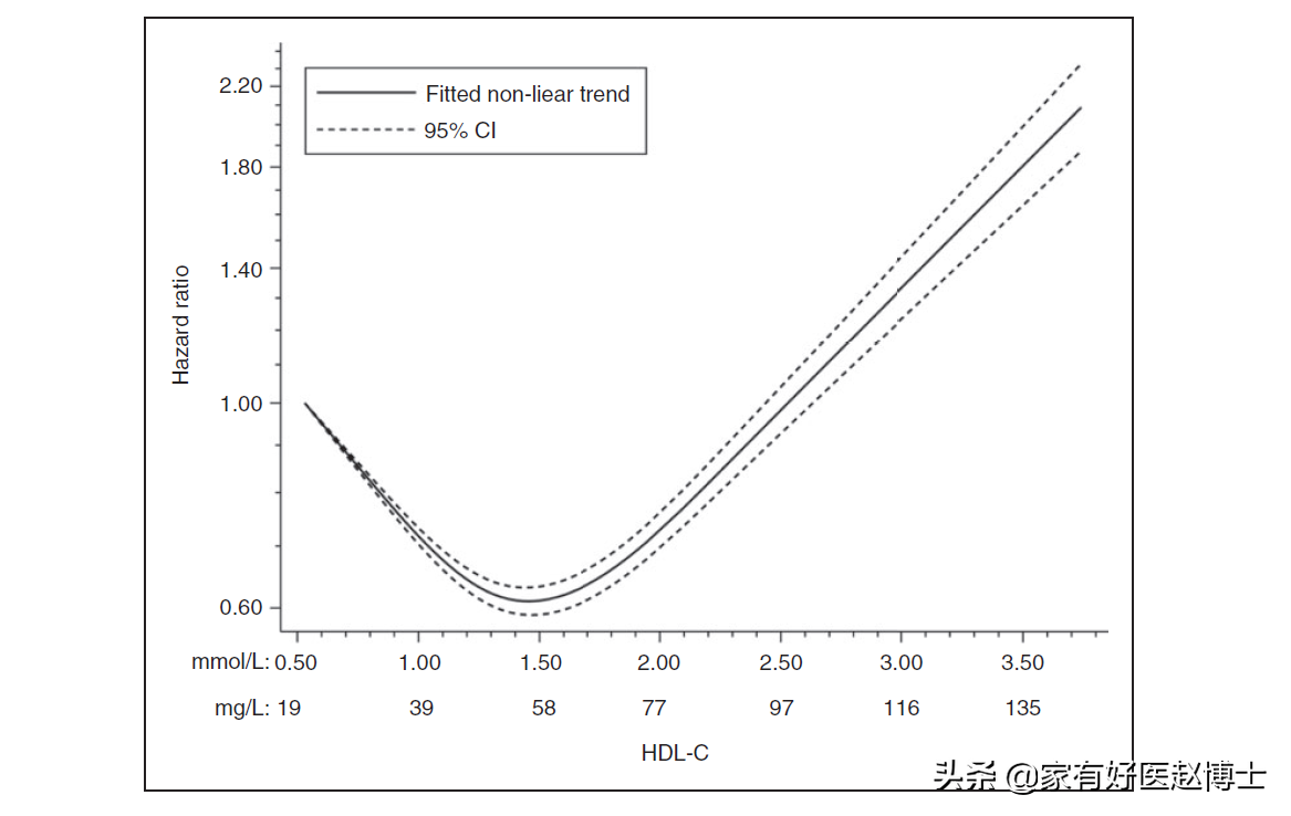 2020年,由我国学者对37项前瞻性队列研究当中352万余人的临床数据进行汇总分析后指出:高密度脂蛋白胆固醇的水平与心血管死亡风险之间呈现出的是一种“J”型关系,就是“过高”和“过低”均会增加死亡风险,只有处于一个“中间水平”是风险最低的。【3】
