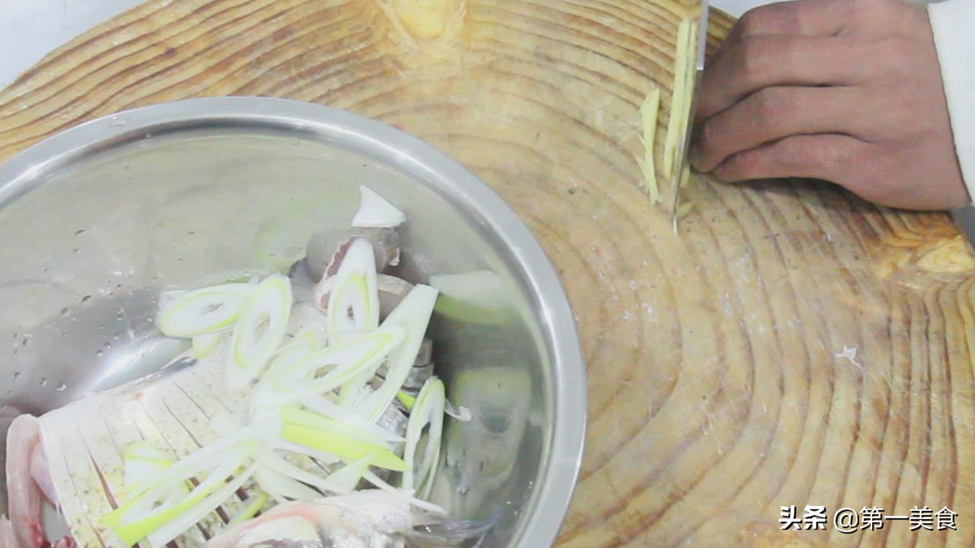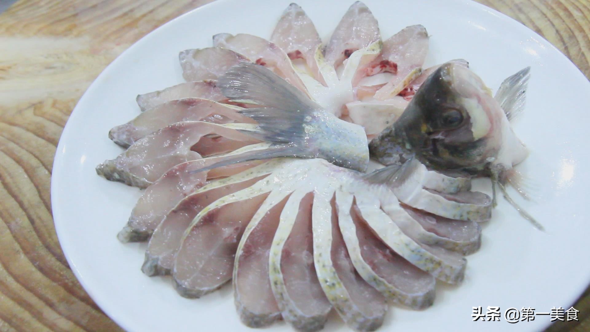 准备武昌鱼一条,处理干净以后(嫌麻烦的朋友们可以让摊主处理)斩去头尾,从背部下刀,鱼腹不切断,每隔0.6厘米左右切一刀。