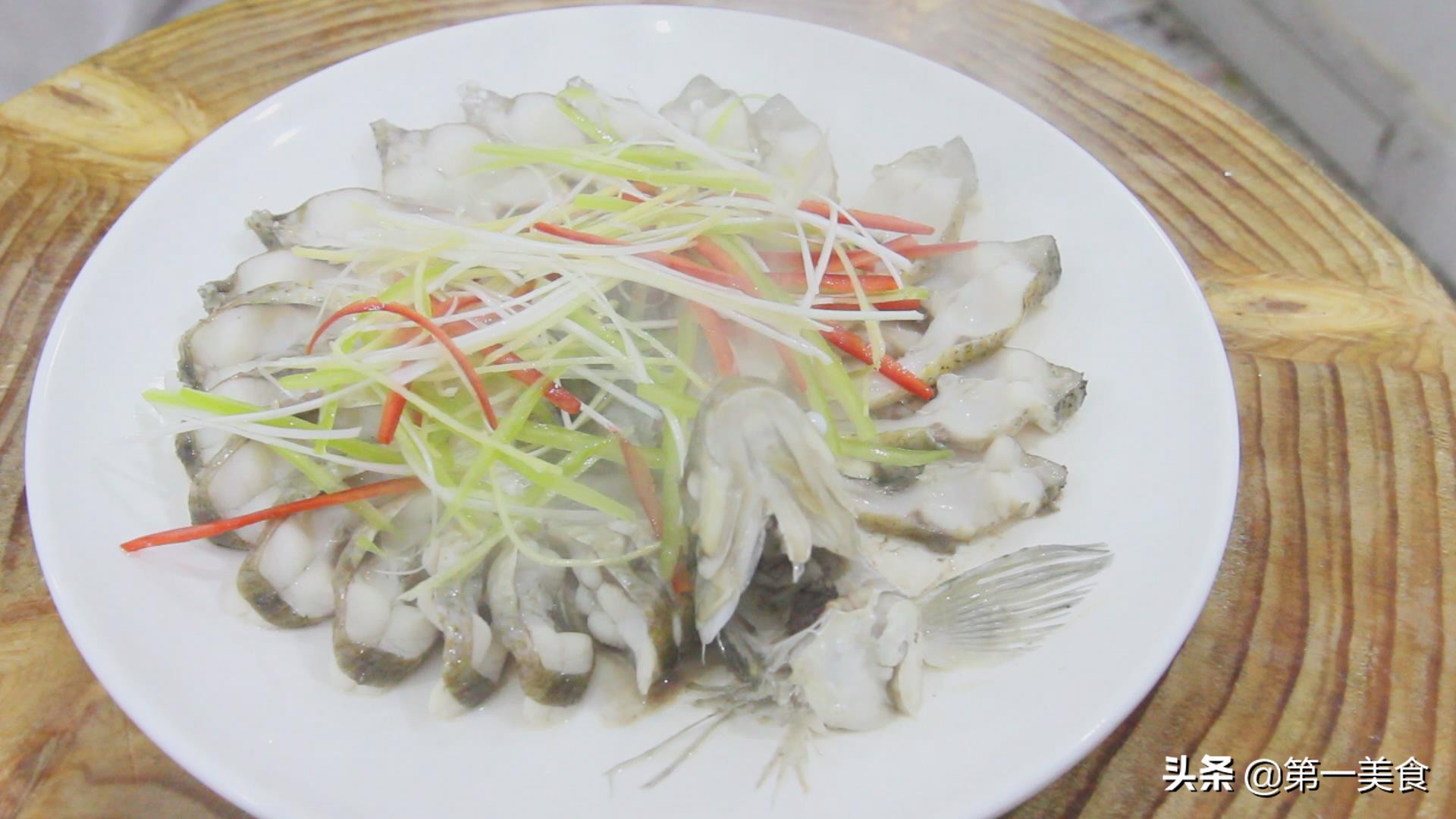10分钟之后,取出武昌鱼,倒出盘子里的水,撒上刚才切好的葱、姜丝,青、红椒丝。