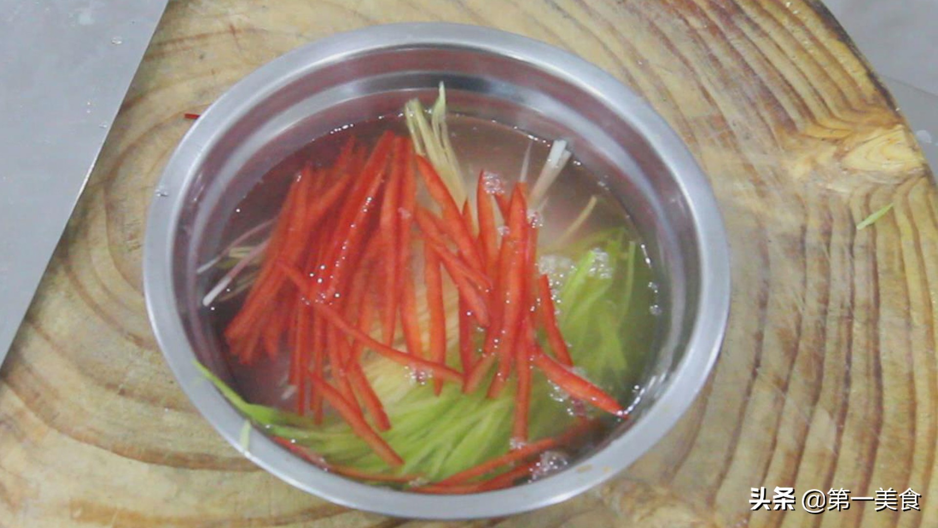 大葱白、生姜切成细丝,青椒,红椒,片薄一点,也切成细丝,然后泡在清水中。