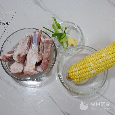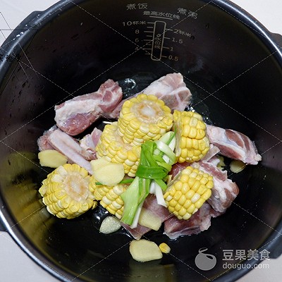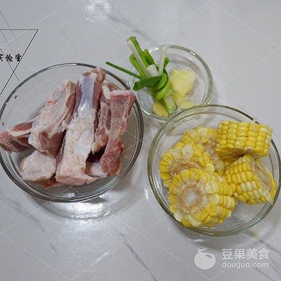 2、泡好的排骨洗净沥水,玉米切块,葱打结姜切片