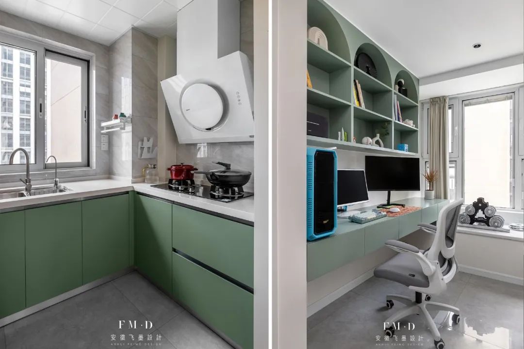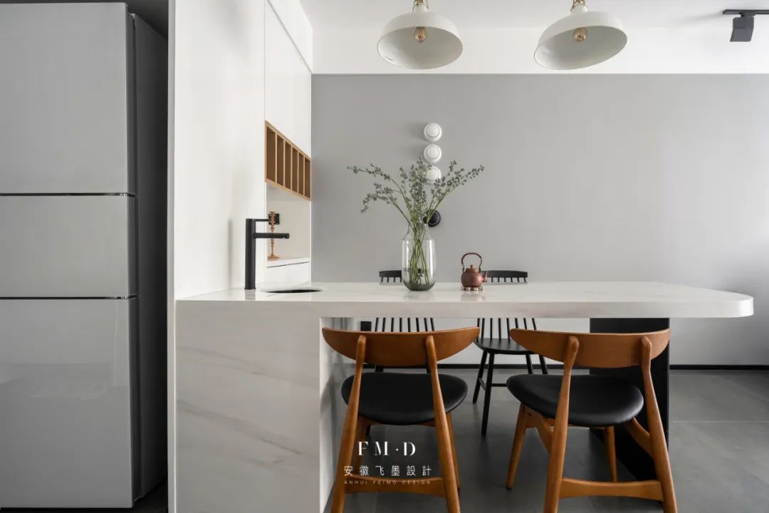 ①扩大厨房面积,并做开放式设计,整体空间更开阔。