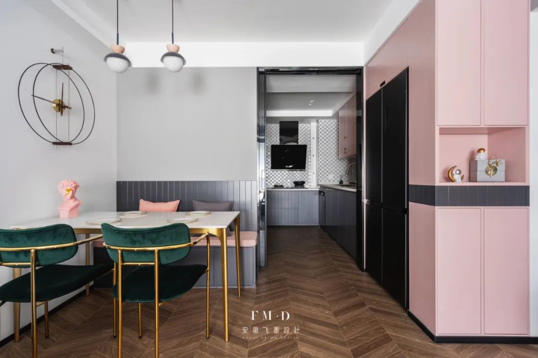 ①客餐厅规划一整排柜体,结合卡座设计,收纳力max。
