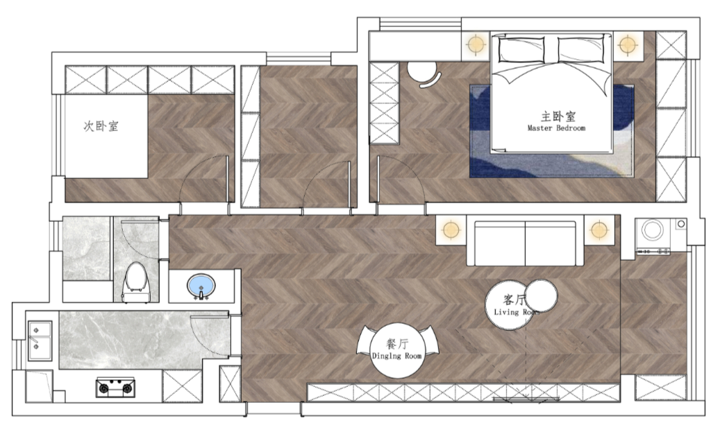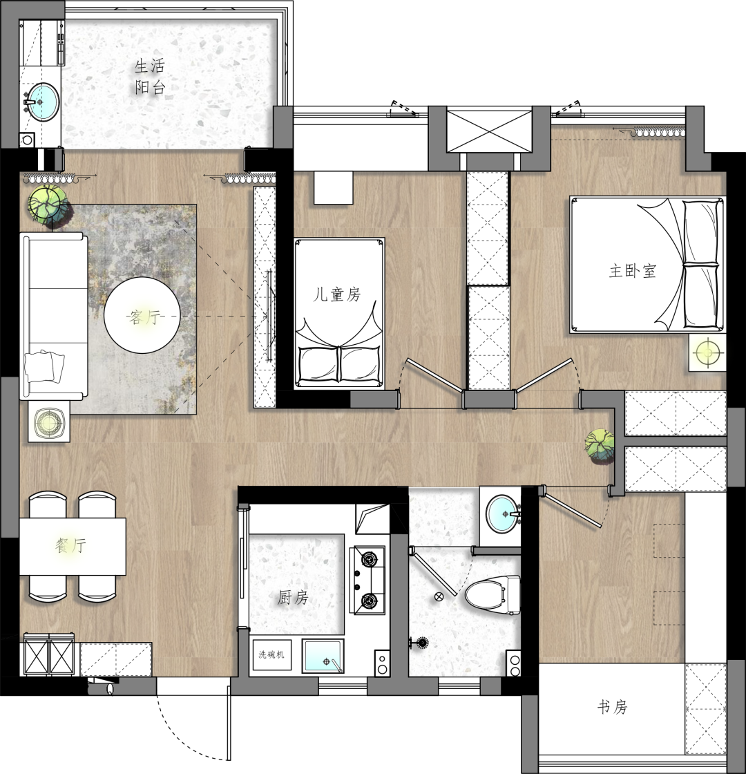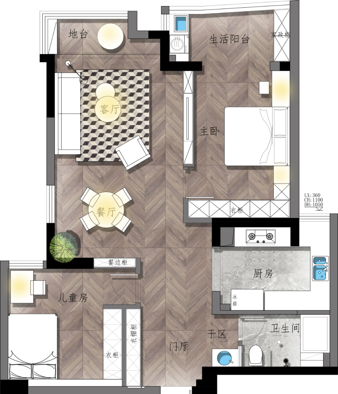 ③客餐厅一体式设计,节省原始餐厅面积给儿童房。
