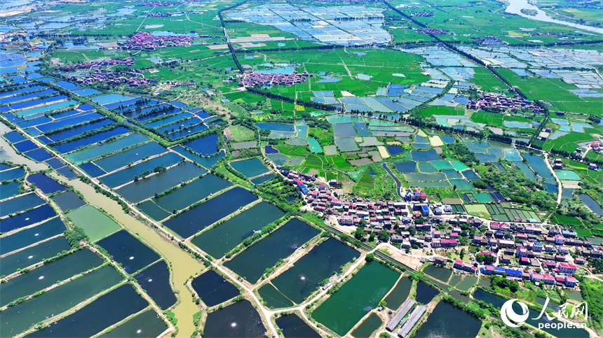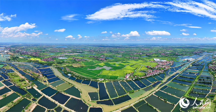 人民网南昌8月2日电(朱海鹏)近日,在江西省南昌市南昌县武阳镇朱坊村,鳞次栉比的鱼塘与乡村房屋、公路、稻田相映相称、风景怡人,构成一幅色彩斑斓的和美乡村画卷。