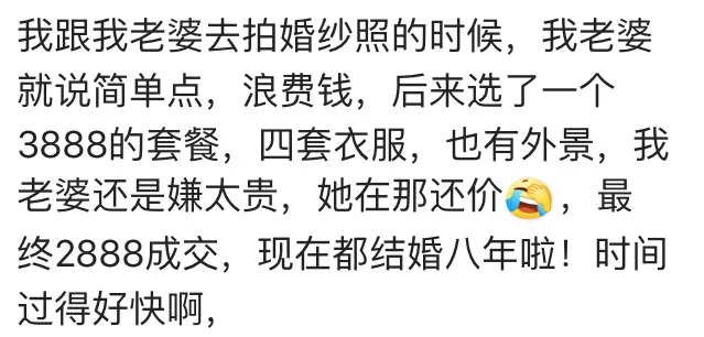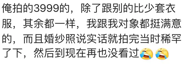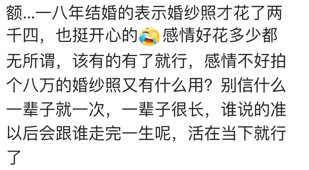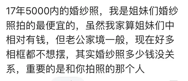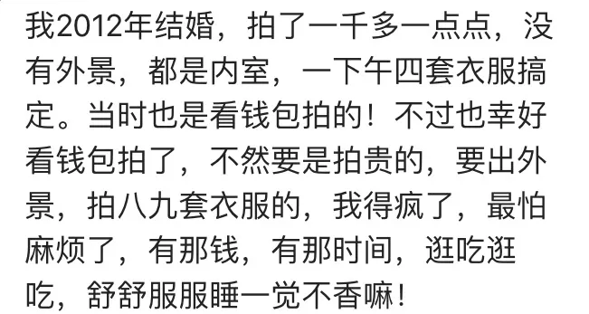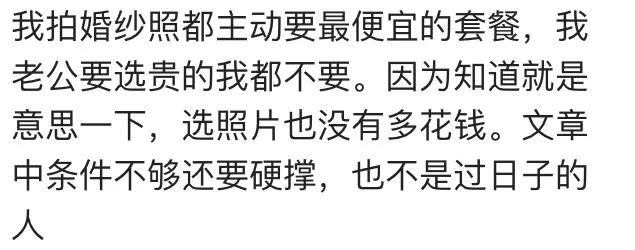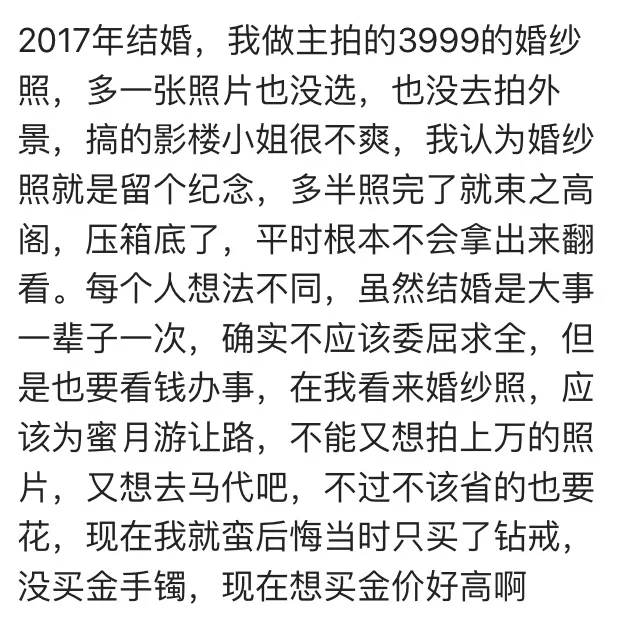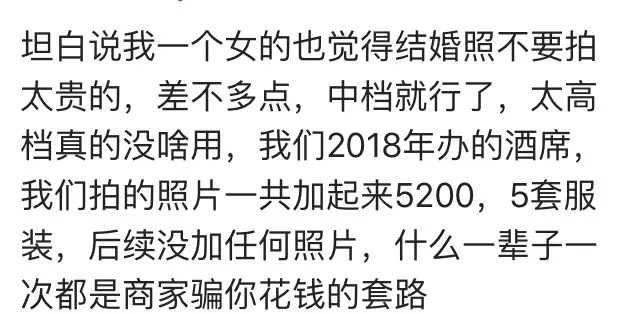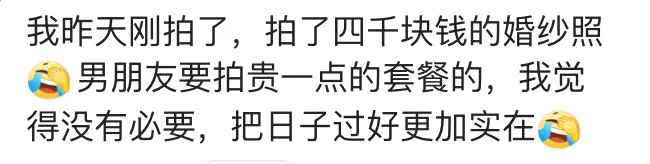 我老公想法也是的,所以我们做拍婚纱照只用了5000,只要了一个大相框,其他全是相册,把所有底片留着,自己有时间了,慢慢看,老了有个回忆就行,没必要随波逐流,不是贵的就是好的,最重要适合自己,而我们两个三观比较合,我们会把钱用来每年两次长途自驾游,隔三差五短途游,因为我们都喜欢到处玩。