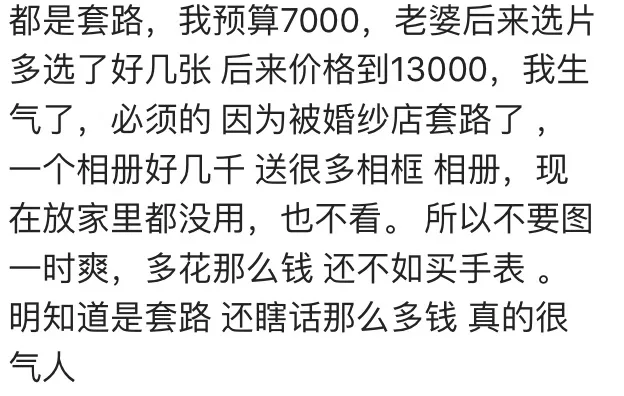我们去年结婚,婚纱照选了铂爵店里最便宜的5000多。后来去选照片,那个销售一直让我多加几张精修,加一张100块,说是一辈子一次吧啦吧啦,我坚决一张没加,我说我自己就会修图,想要底片拿回去自己修就好了,那销售说他们客人没有一张都不加的,气得不行,结婚照都是压箱底的,我们那些大相框都放在角落积灰,太占地方了。当时我问他们能不能不要大相框给便宜点,他们说套餐改不了