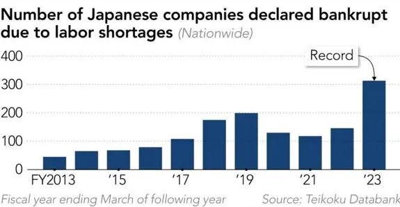 日本帝国数据库公司指出,因劳动力短缺而破产的公司,在去年已经创下自10年前开始收集数据以来的最高纪录,多达313家。