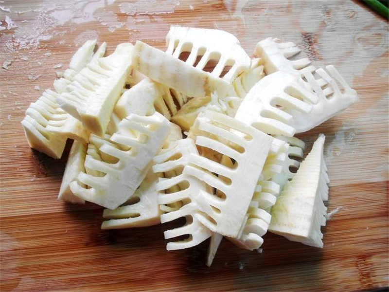 新鲜的竹笋会带有稍许的涩苦味(有些品种的苦些,有些则基本吃不出来),所以去壳以后的竹笋,一般要先砍成大块,放进水里,煮一下焯一道,冲洗一下,再拿来改刀切片切块切丝,做其他烹饪处理。