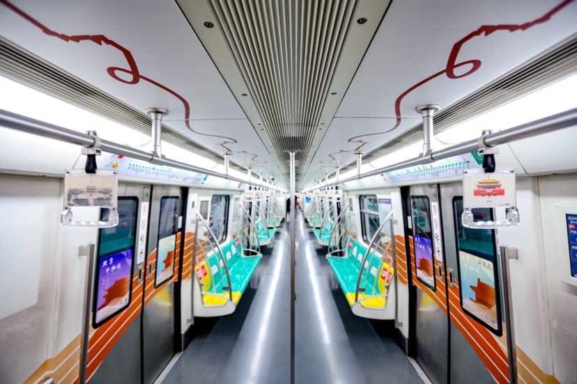 除了车站内无处不在的中轴元素,北京地铁还与北京京企中轴线保护公益基金会在地铁8号线共同打造了一列独一无二的“中轴线专列”,在外观、内饰的设计中融入了15个北京中轴文化遗产点建筑元素,每节车厢的车门上都张贴着中轴线文化展示图片,座椅上也增加了中轴线建筑剪影贴纸,扶手拉环上是中轴线手绘风景。同时,专列还融合了数字化内容和体验,乘客可以通过扫码“云上中轴”小程序,在线感受北京中轴线文化遗产风貌,为广大乘客提供了一个“可见、可感、可体验、可触摸”的沉浸式乘车体验,从而形成一条流动的中轴文化带。