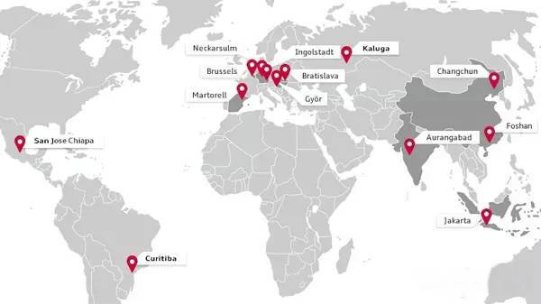 奥迪在全球共设立十处生产基地,分别位于匈牙利、中国、比利时、巴西、俄罗斯、印度、印尼、斯洛伐克和西班牙以及德国。