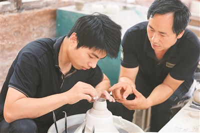 伍士指着旁边正在拉坯的年轻人介绍:“这是我弟弟伍超,他从江西陶瓷工艺美术职业学院陶瓷绘画专业毕业后,也回来加入传承队伍。”