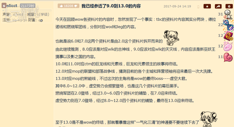 2017年9月24日,一位ID为“solicct”的用户曾于NGA发表过一个帖子《我已经参透了9.0到13.0的内容》,对魔兽世界未来6个大版本的主题进行了推理。