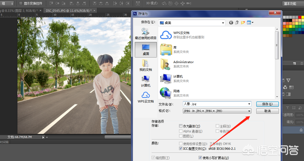 第八步、图片导出,这是最后一步,也是最关键的一步,图片另存为,快捷键ctrl+shift+S,选择照片输出的存放位置,注意图片的格式,点击保存即可。