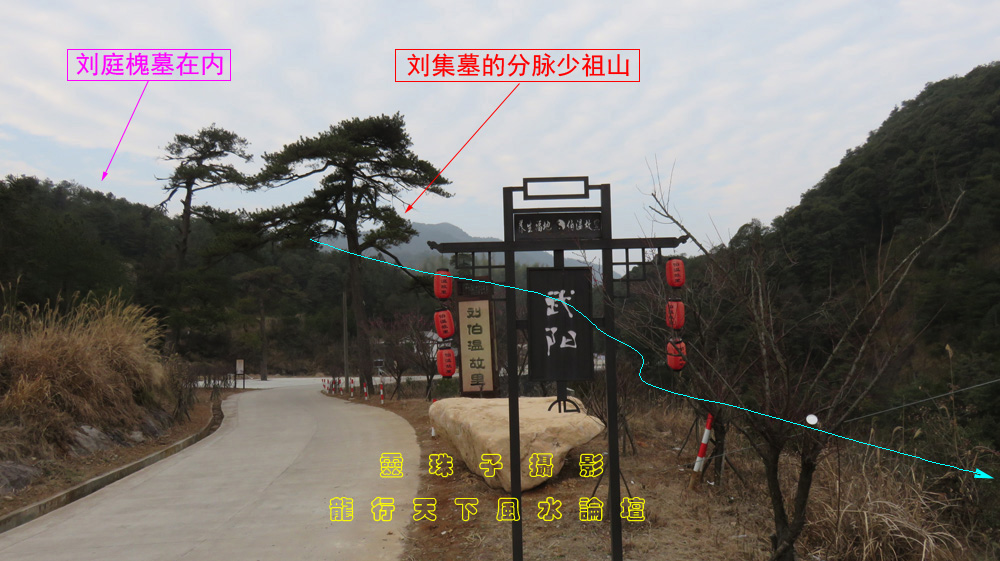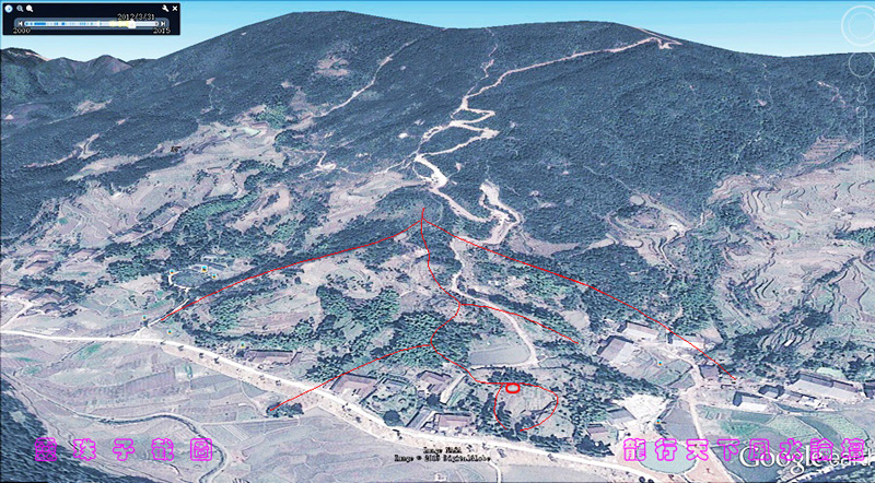 图1,刘伯温的祖父墓和高祖墓都是在同一大局之内,看图中红圈为刘庭槐墓,绿圈为刘集墓。