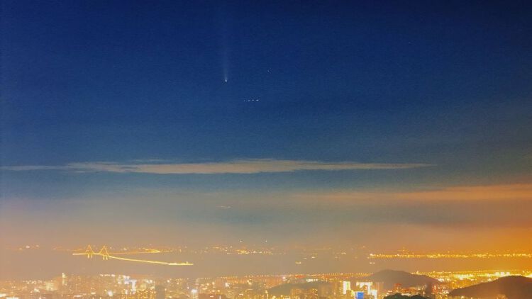 同学们在哈工大深圳校区校园上空,用无人机也“捕捉”到了彗星的身影,它与深中通道“同框”,显得别样浪漫。