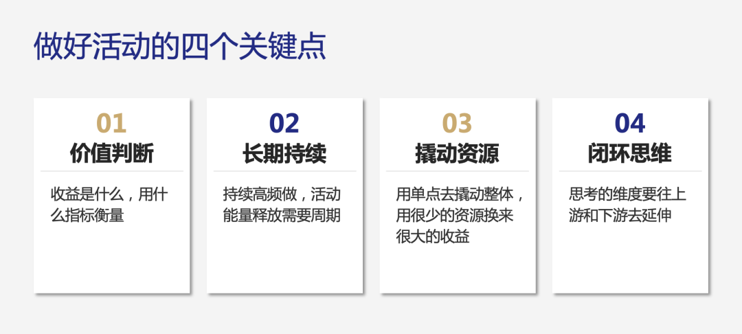 策划活动时,不能仅仅把它当作一个单点行为来看待,而是要用闭环思维去考虑整个业务流程。如果一个活动是为了增长获客,活动后如何承接这些用户的需求、提升复购率,甚至如何在渠道上进一步优化投放策略,都是需要思考的内容。这样才能保证活动不仅短期有效,还能在长期为业务带来增益。