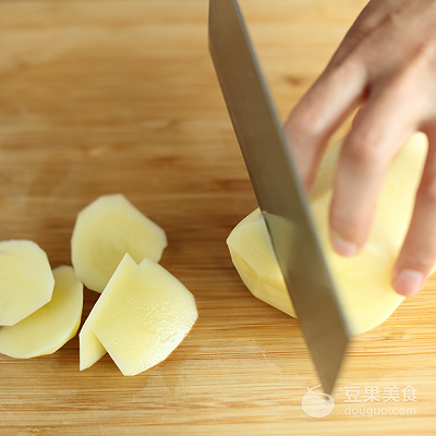 2、土豆去皮洗净,切成滚刀块,浸入清水中备用。