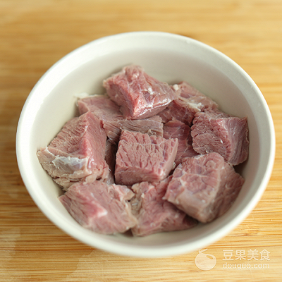 3、牛肉去筋,然后切成和土豆差不多大小的块,在清水中泡净血水。