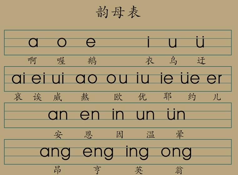 a[阿] o[喔] e[鹅] i[衣] u[乌] ü[迂]